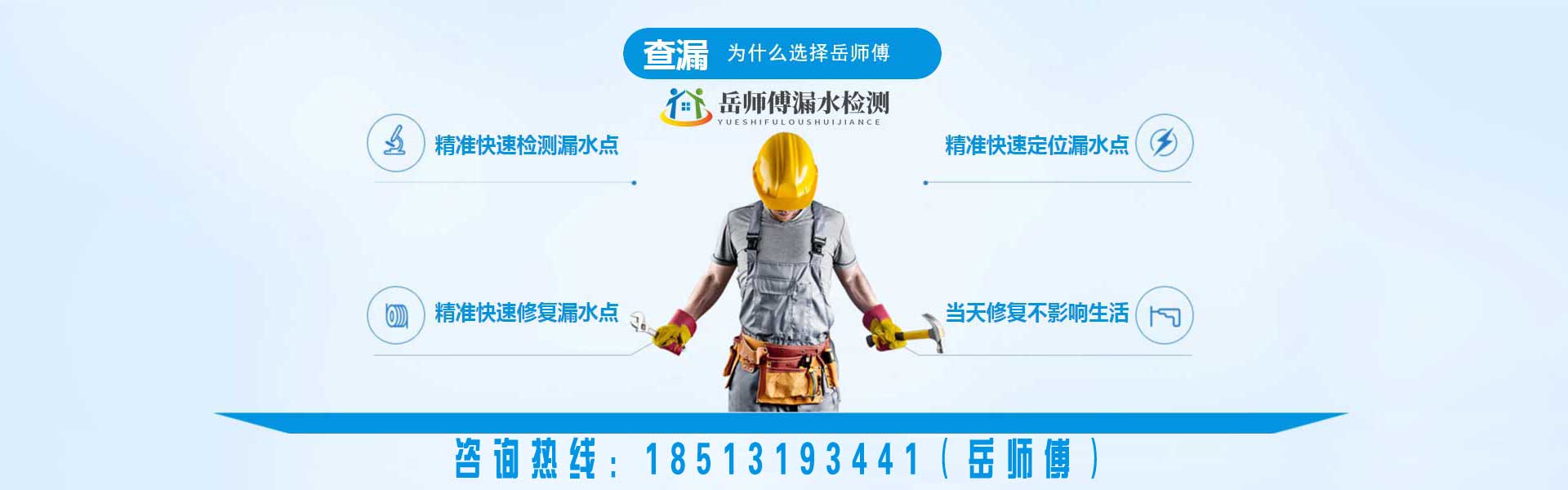 北京岳師傅漏水檢測維修(北京京誠快修漏水檢測有限公司)專業從事漏水檢測維修服務,包括衛生間漏水檢測,廚房漏水檢測,房屋漏水檢測,地暖漏水檢測,管道漏水檢測,家庭暗管滲水查漏,室內外漏水檢測,暗管漏水檢測等,針對各種漏水檢測維修情況提供最佳方案及服務。引進進口設備儀器,配備相關儀,巡管儀,熱像儀,測漏儀,氣體示蹤儀專業設備查找室外暗埋熱力管網漏水,自來水管網漏水消防管網漏水,探測深度可達地下5米深的500型管道漏水點精準定位。室內漏水精準定位漏水點、零誤差維修墻角起堿、掉皮。免砸磚維修防水,水管打壓。以技術領先為基、誠信服務為準、質量保證為則,建立一批技過硬的技術人員經驗豐富服務領先的工程團隊,...
